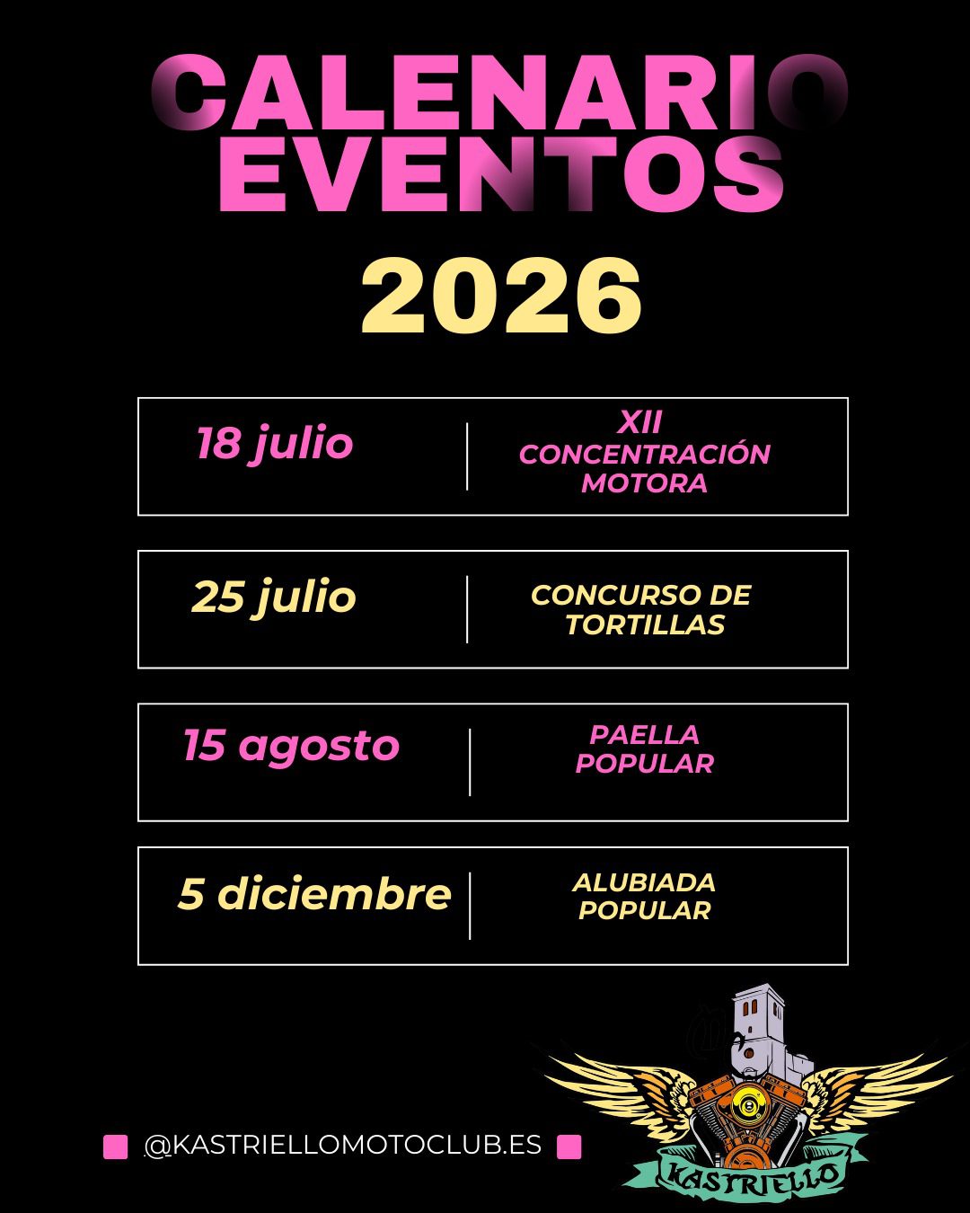 El Motoclub Kastriello presenta su Calendario de Eventos 2026, un año cargado de tradición, motor, buena comida y convivencia. Como siempre, nuestras actividades están pensadas para disfrutar en familia, entre amigos y con toda la comunidad motera que año tras año nos acompaña.